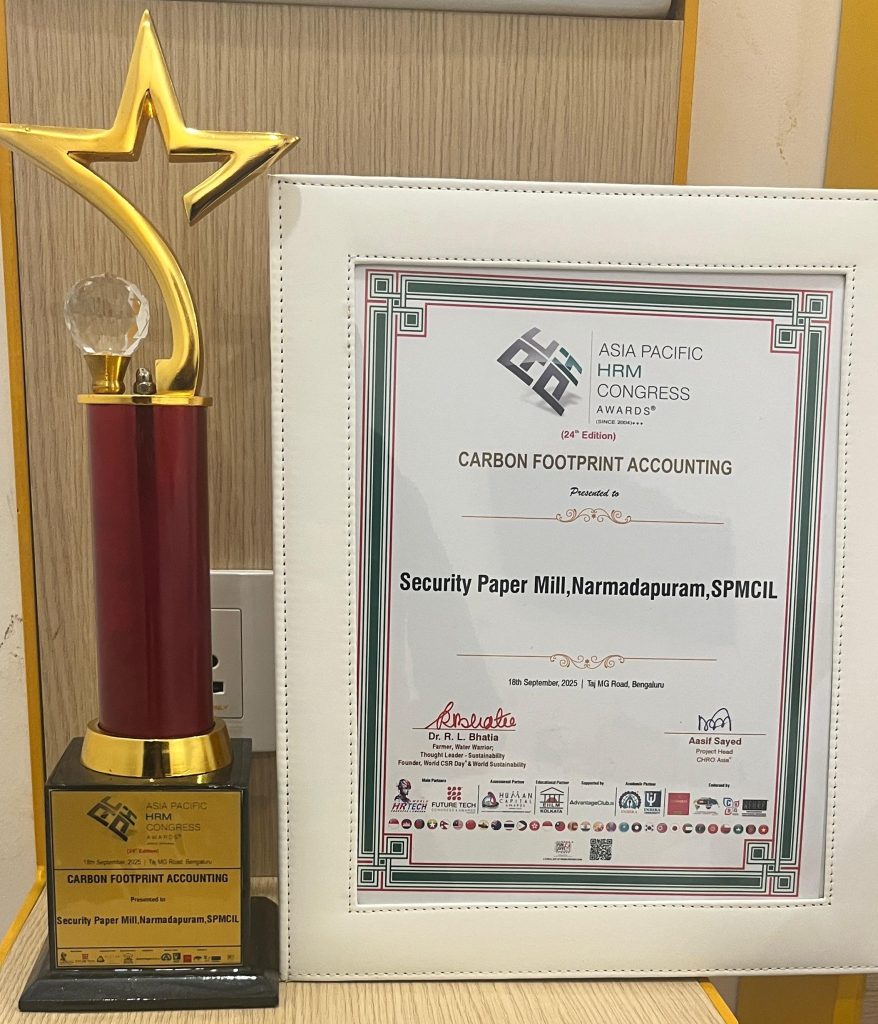 Security Paper Mill Narmadapuram SPMCIL was honoured with an Award in Asia Pacific HRM Congress 2025 held at Bengaluru on 18 September 2025 SPM received Award for Carbon Footprint Accounting in Org